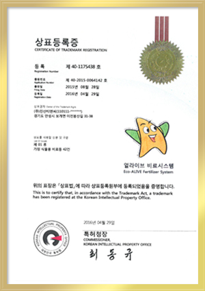 Alive의 특허기술과 등록증 01상표등록증(얼라이브 비료) 02기업부설연구소 인증서 03벤처기업 확인서 04상표등록증(서스테인그로) 05유기농업자재 인증서 06이노비즈 확인서 07상표등록증(얼라이브 농산물) 08특허증 (주)진산티앤씨 인증서&확인서 ◁ ▷ □